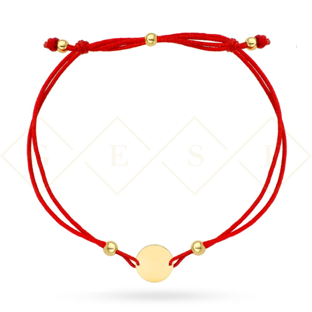 Bracelet with a gold circle and balls on a red string