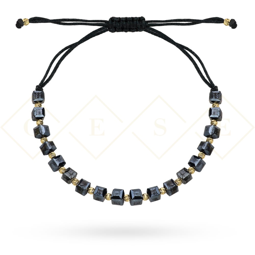 Fashionable and stylish 585 gold bracelet with graphite and holographic stones reflections separated by gold balls on a black string.