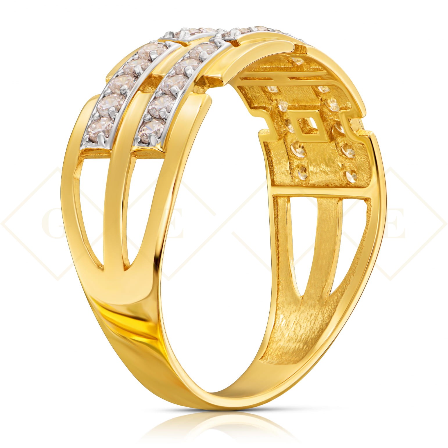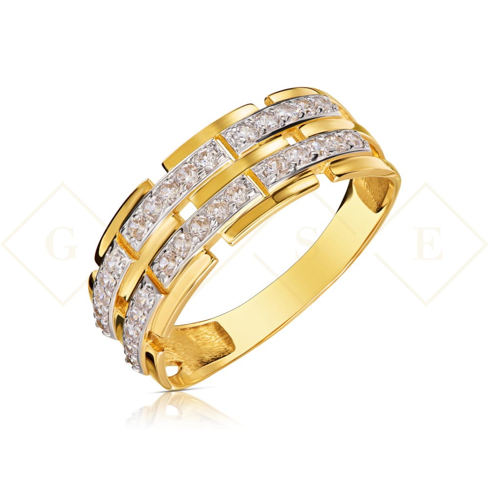 Fashionable gold ring, wide wedding band, cubic zirconia. 333