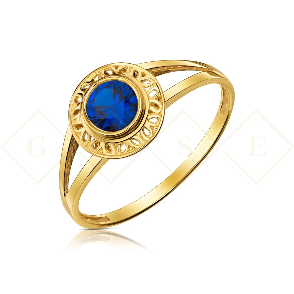 Gold openwork ring with blue stone. 333