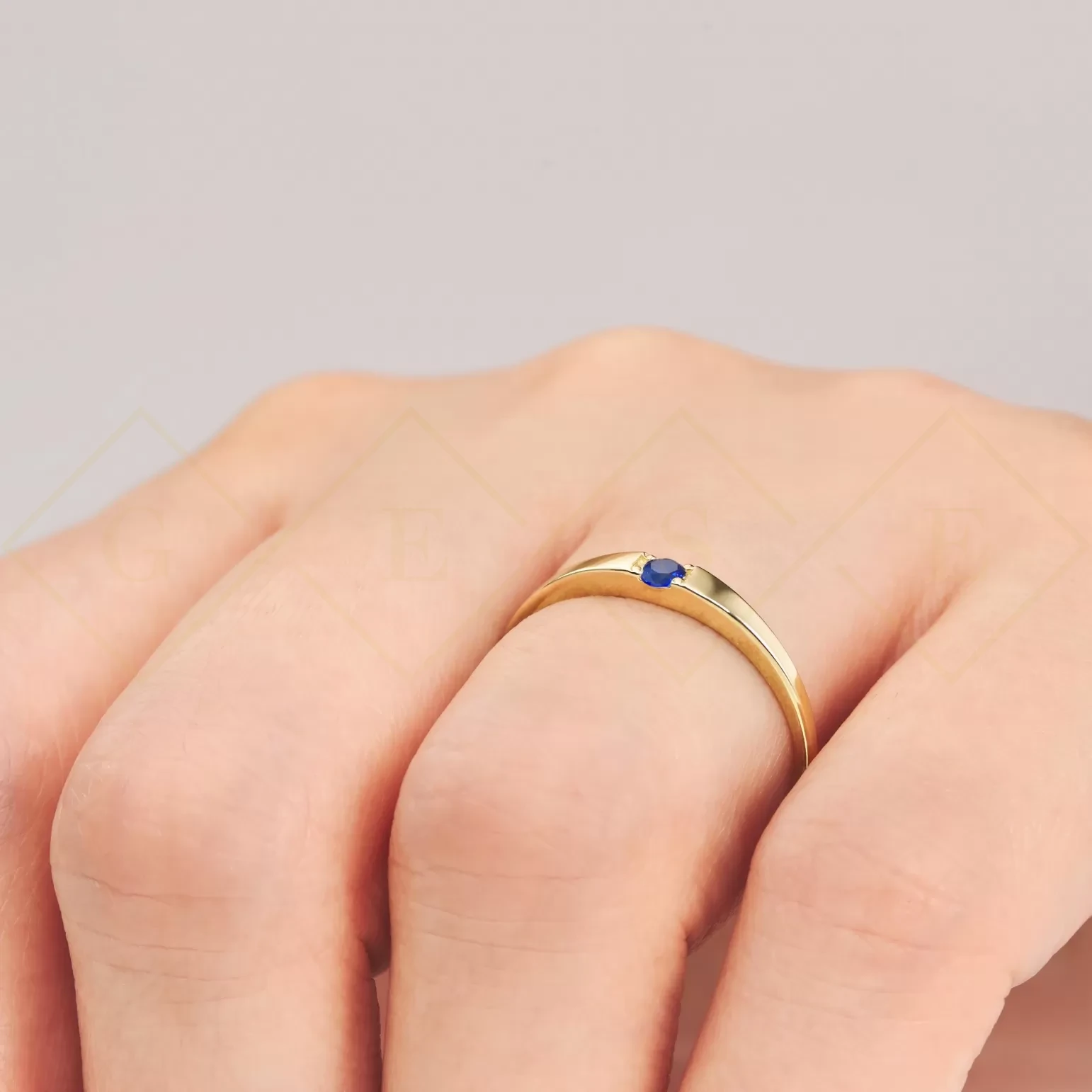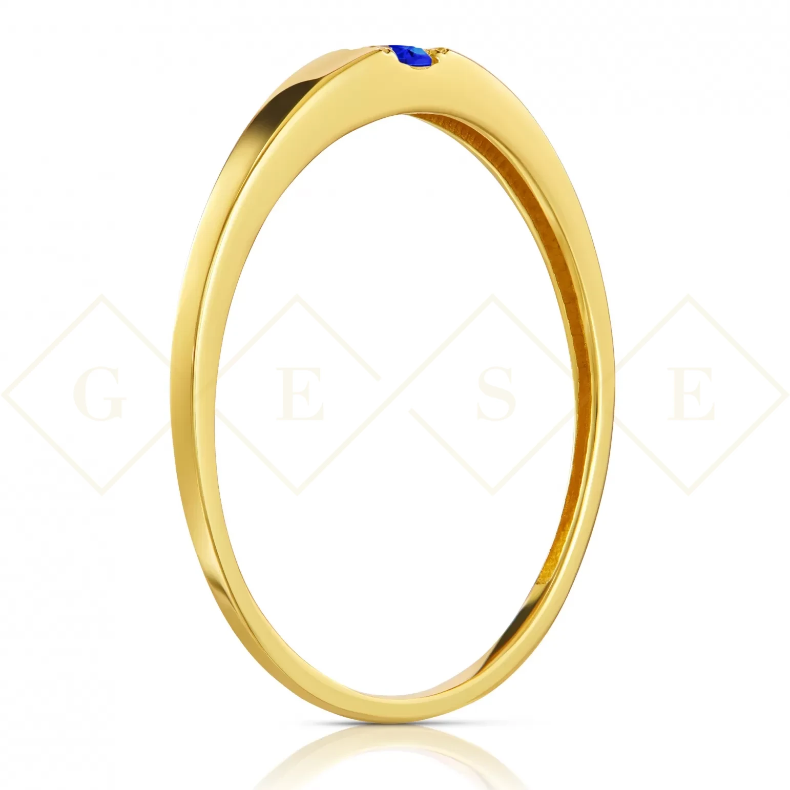 Golden ring with a beautifully integrated blue central stone. On a woman's hand, the ring looks very feminine, delicate and elegant.