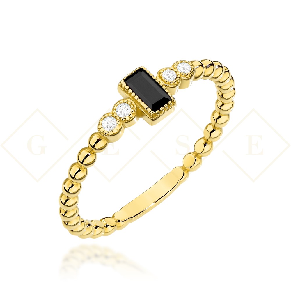 Gold ring made of balls with black stone and zircons