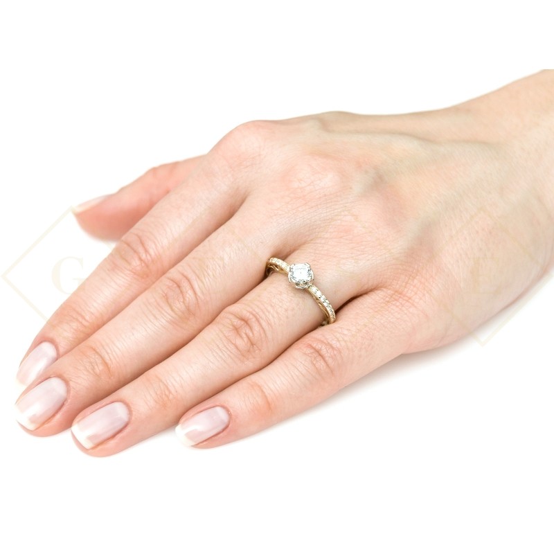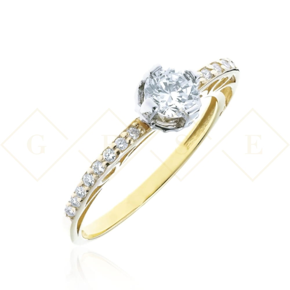 An original, openwork ring design combining the beauty of yellow and white gold. It will look expressive and attractive on a woman's hand.