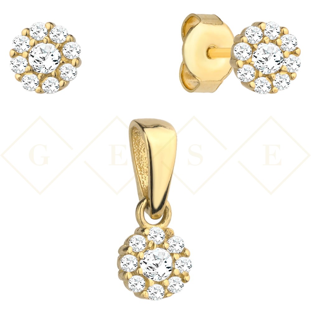 Set of earrings + zircon flower pendant in a gold circle