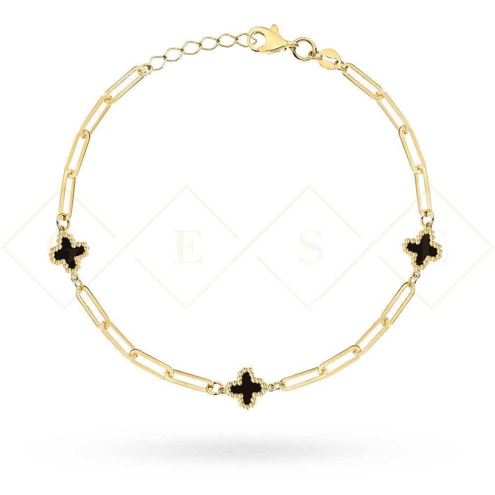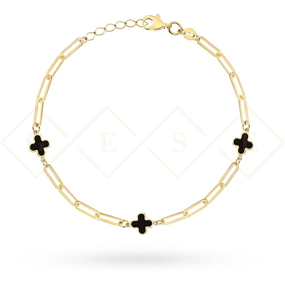 Bransoletka złota długie ogniwa i czarne koniczynki