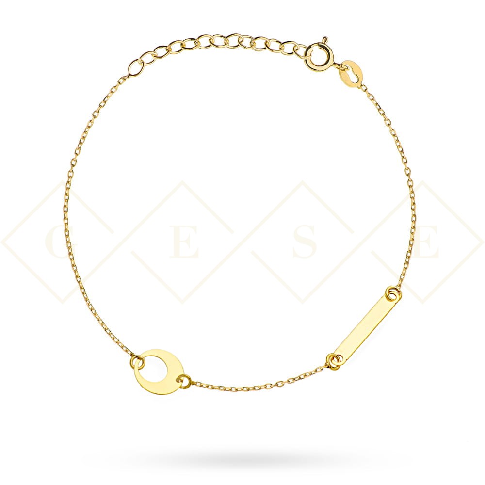 Precyzyjnie wykonana złota celebrytka bransoletka próby 585. Łańcuszek ankier i zawieszka kółko w kole oraz blaszka.