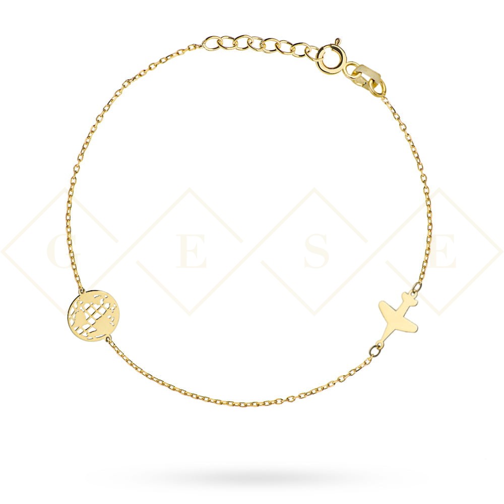 Precyzyjnie wykonana złota bransoletka celebrytka próby 585 z modną zawieszką w kształcie kuli ziemskiej i samolotu. Bransoletka jest doskonałym pomysłem na prezent dla bliskiej osoby na urodziny, imieniny, walentynki czy też jubileusz.