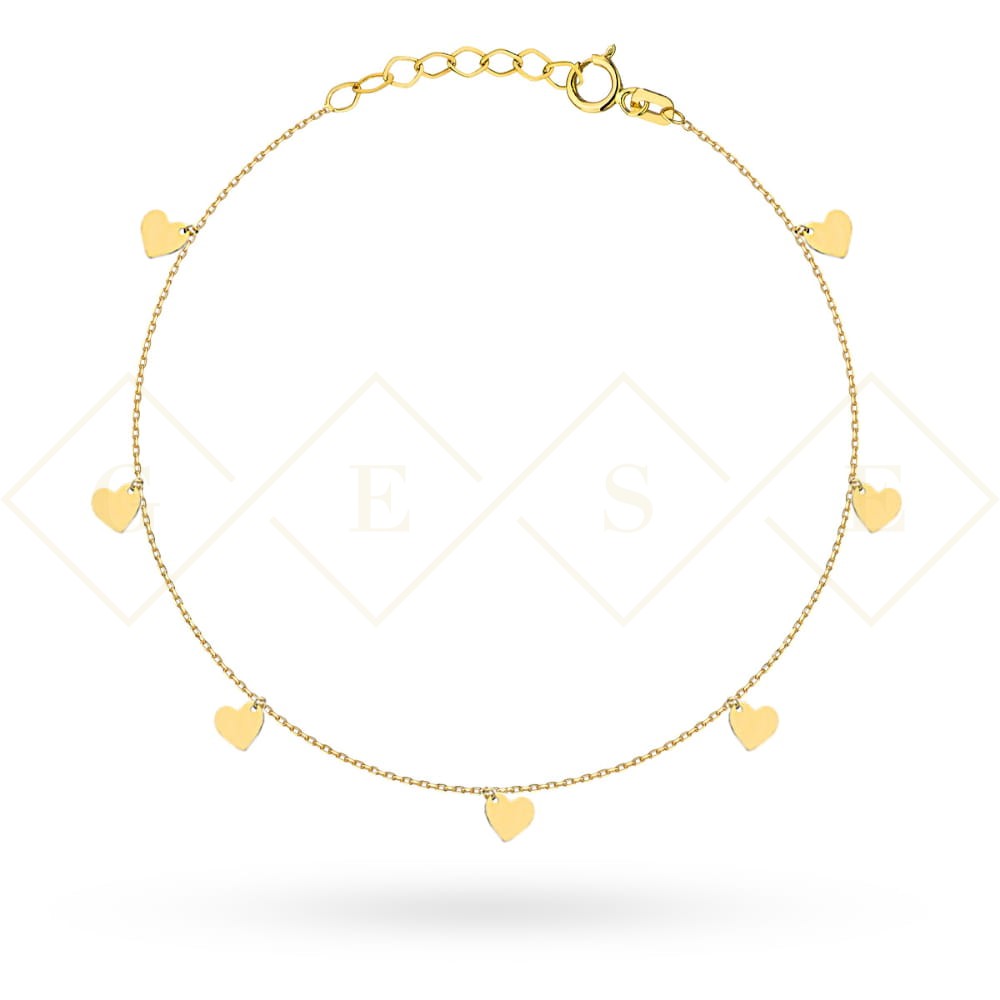 Bransoletka złota z pełnymi wiszącymi serduszkami na nogę w pr. 585.