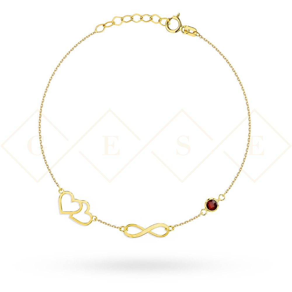 Bransoletka złota serca, nieskończoność i kamień w kolorze rubinowym