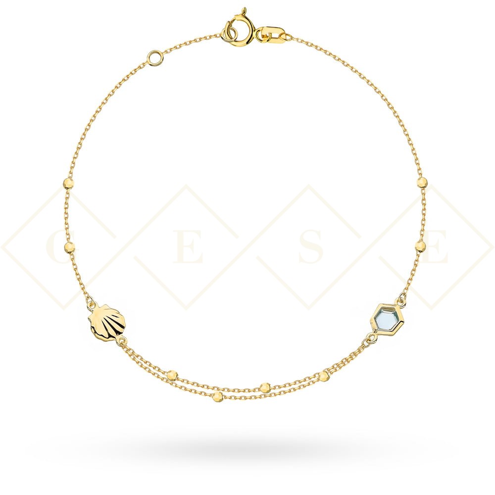 Bransoletka złota z błękitnym kamieniem, muszlą i kulkami party