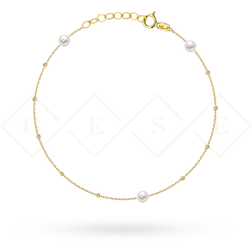 Precyzyjnie wykonana złota bransoletka próby 585 z delikatnymi diamentowanymi kuleczkami i perłami.