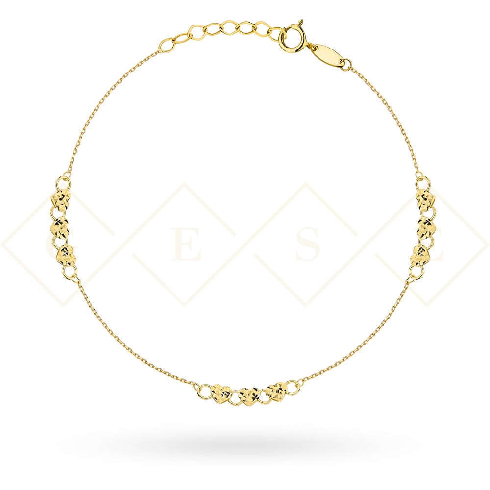 Precyzyjnie wykonana złota bransoletka próby 585 z serduszkami z diamentowanym przodem i gładkim tyłem.