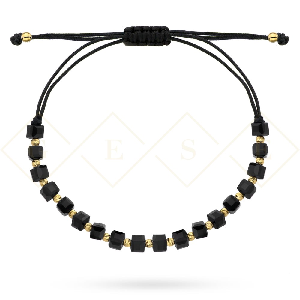 Bransoletka złote diamentowane kulki i czarne kamienie na sznurku