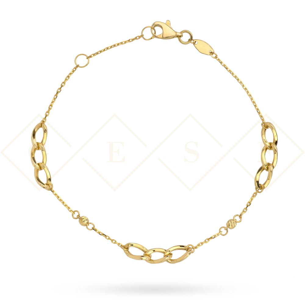 Precyzyjnie wykonana złota celebrytka bransoletka próby 585. Łańcuszek z diamentowanymi kulkami i elementami grubszego łańcucha.