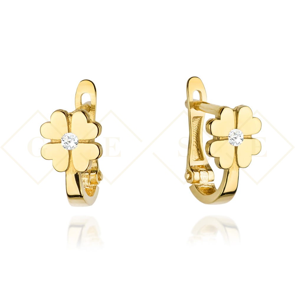 Kolczyki złote czterolistna koniczyna z białą cyrkonią
