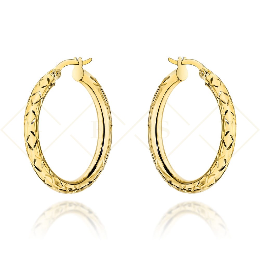 Precyzyjnie wykonane złote kolczyki koła zdobione diamentowaniem próby 585.