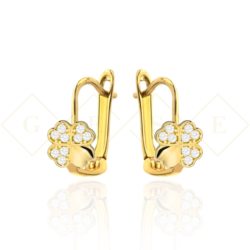 Kolczyki złote koniczynka z cyrkoniami na angielskim zapięciu