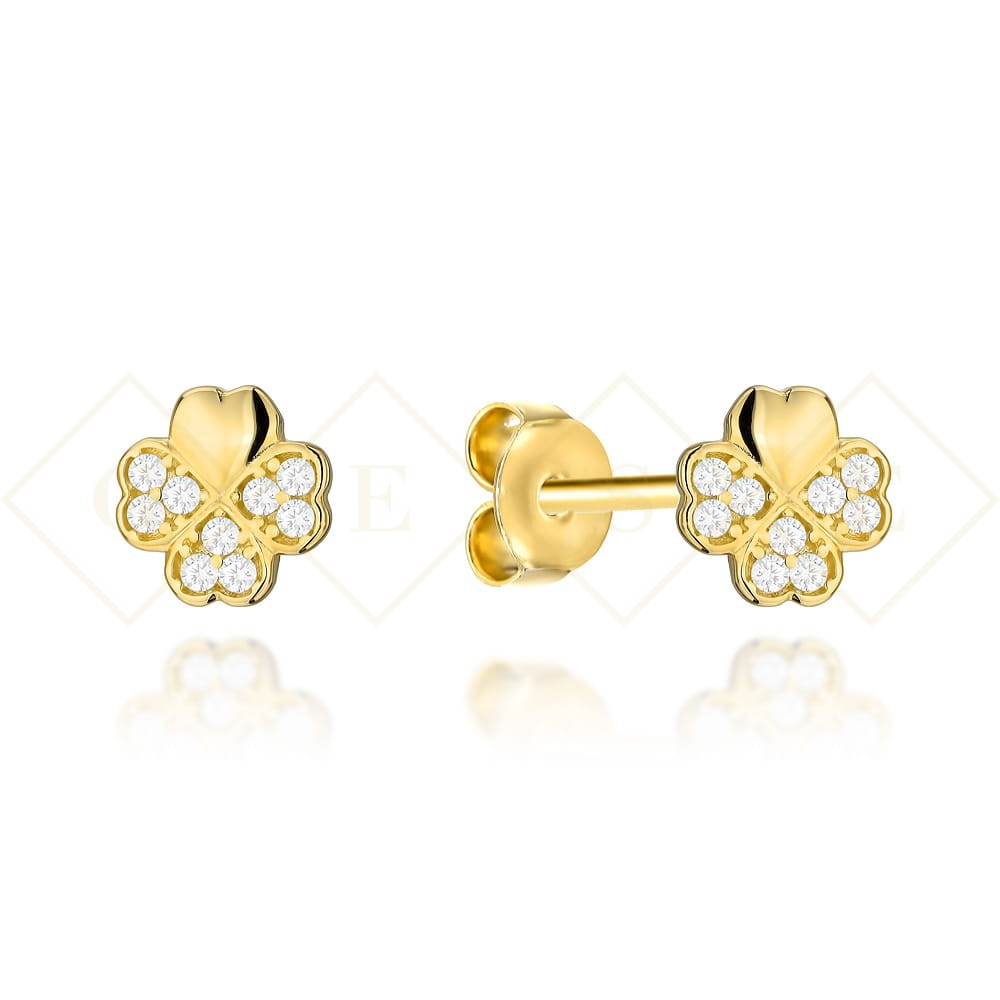 Kolczyki złote koniczynka z cyrkoniami na sztyfcie