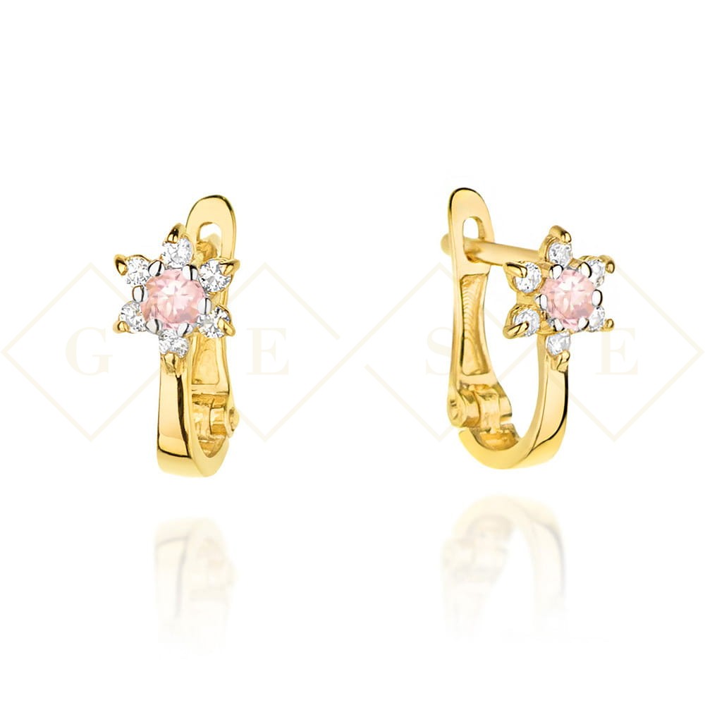 Kolczyki złote kwiatuszki z cyrkoniami i środkiem w kolorze różowym