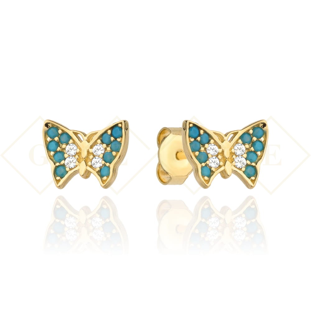 Kolczyki złote motylki z niebieskim kamieniem i białą cyrkonią