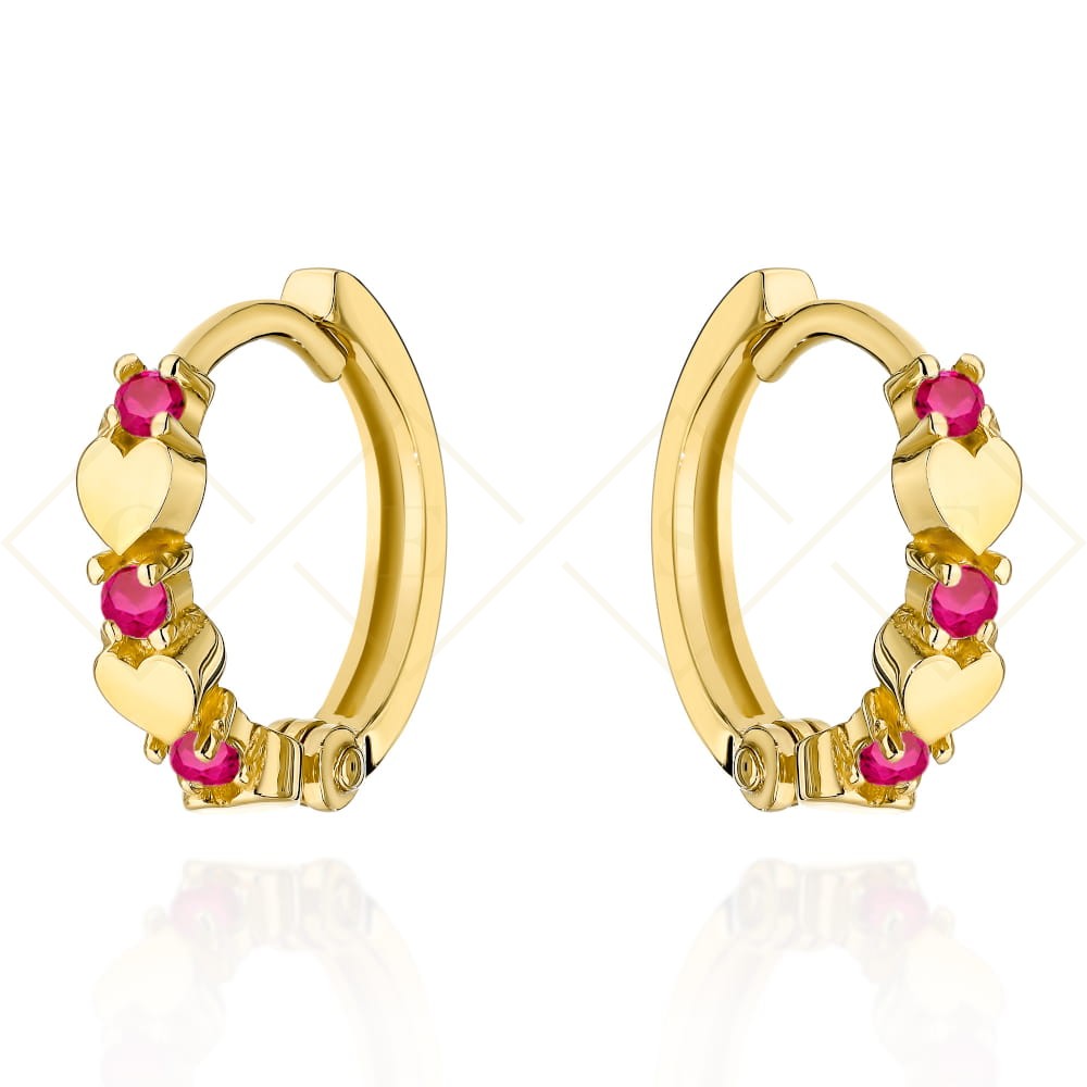 Kolczyki złote serduszka z fuksjowymi cyrkoniami na kreolu