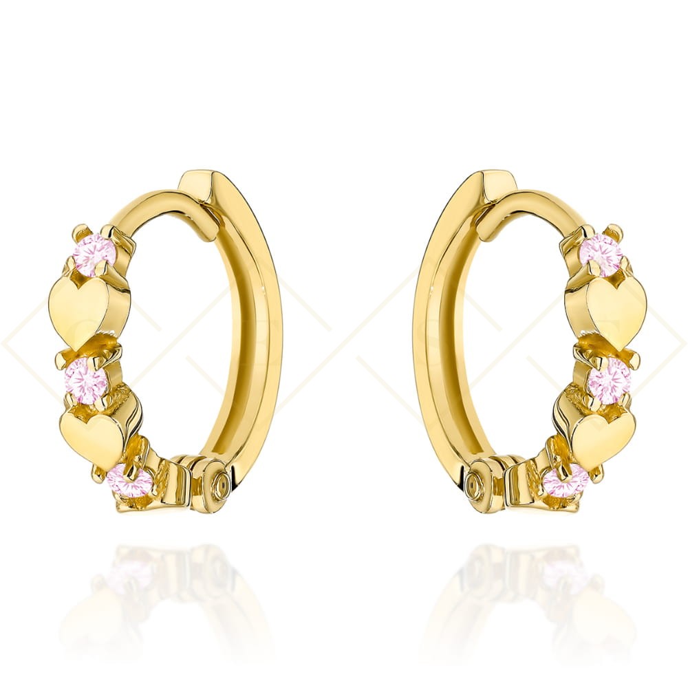 Kolczyki złote serduszka z różowymi cyrkoniami na kreolu