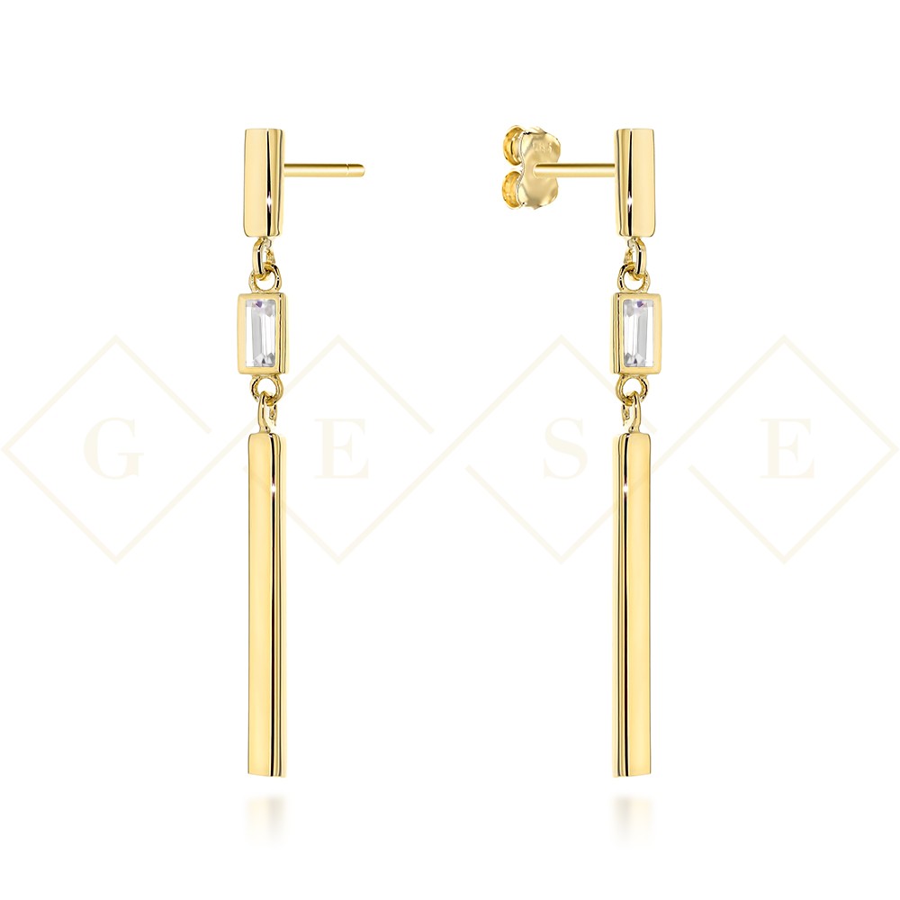 Kolczyki złote wiszące pałeczki z białym kamieniem