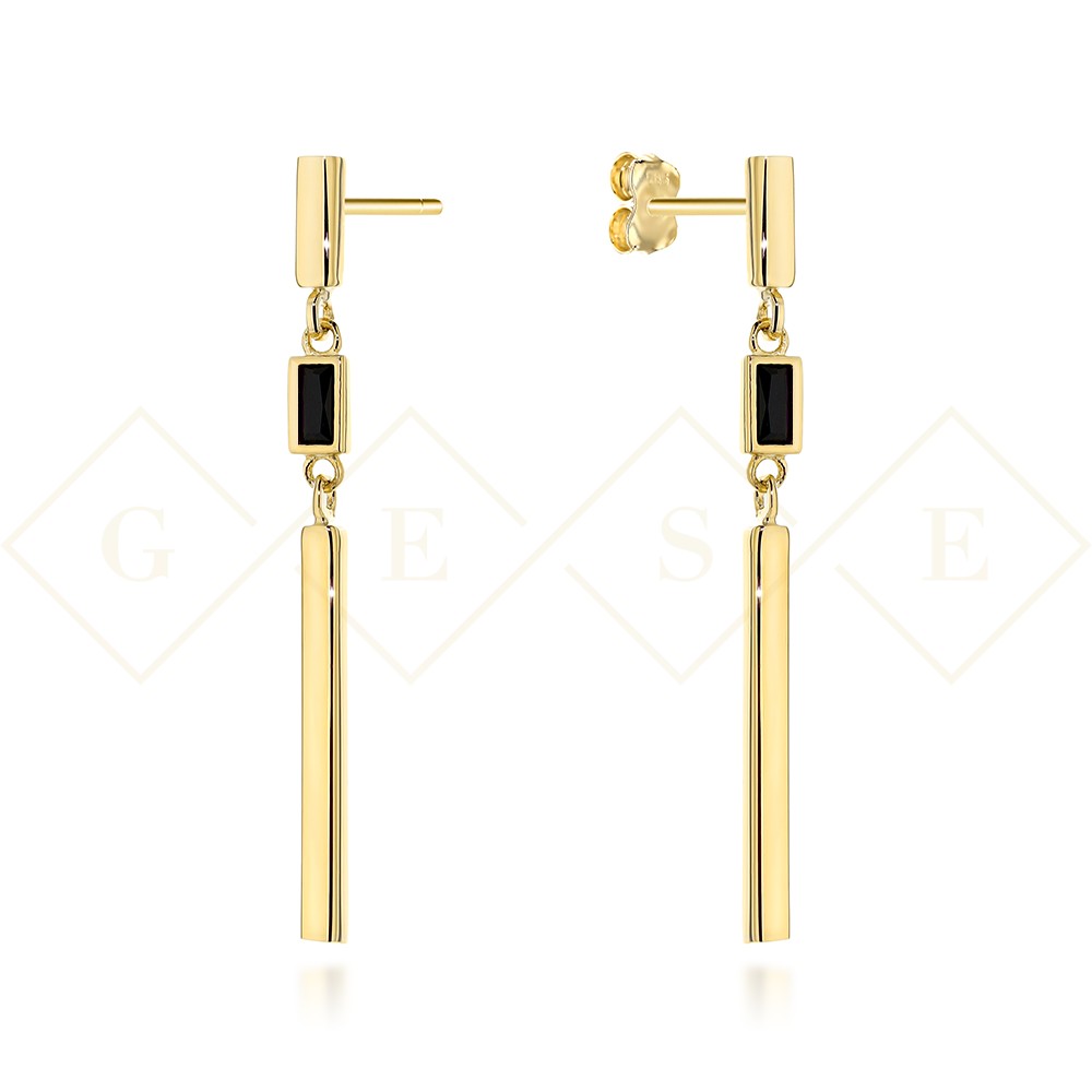 Kolczyki złote wiszące pałeczki z czarnym kamieniem