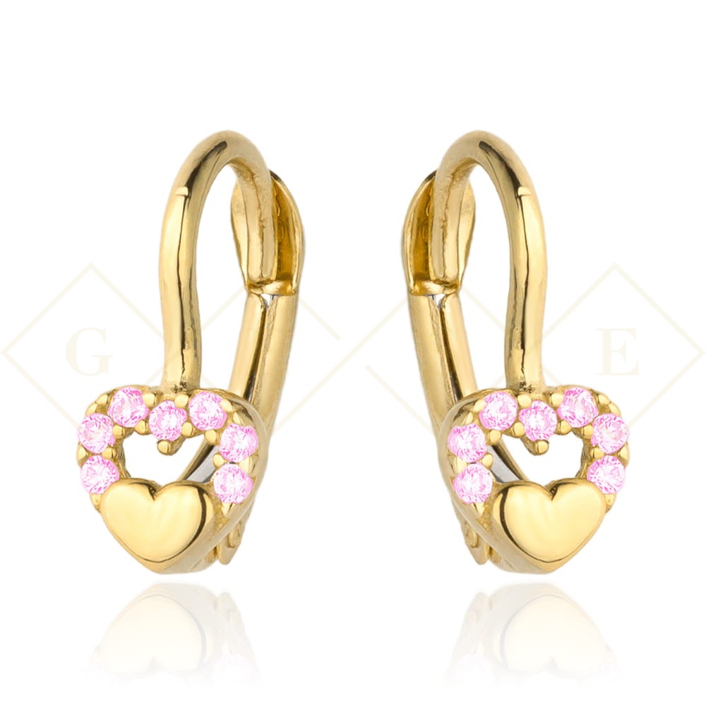 Kolczyki złote wypukłe serduszko w sercu z różowych cyrkonii