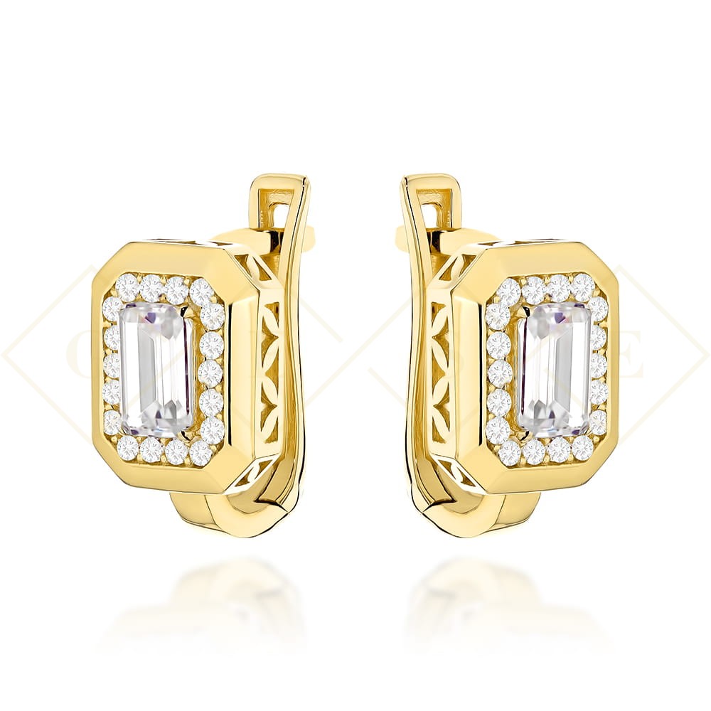 Kolczyki złote z kwadratowym kamieniem i cyrkoniami na angielskim zapięciu