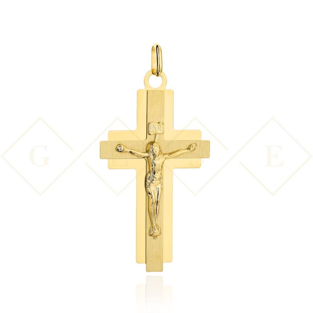 Krzyżyk złoty satynowy w błyszczącej oprawie z Jezusem średni