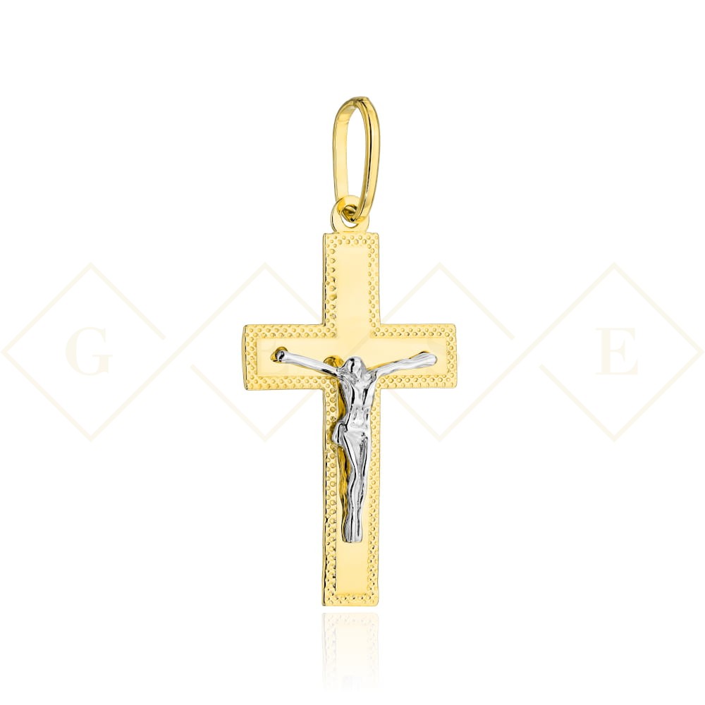 Krzyżyk złoty zdobiony diamentowaniem z Jezusem w dwóch kolorach złota średni