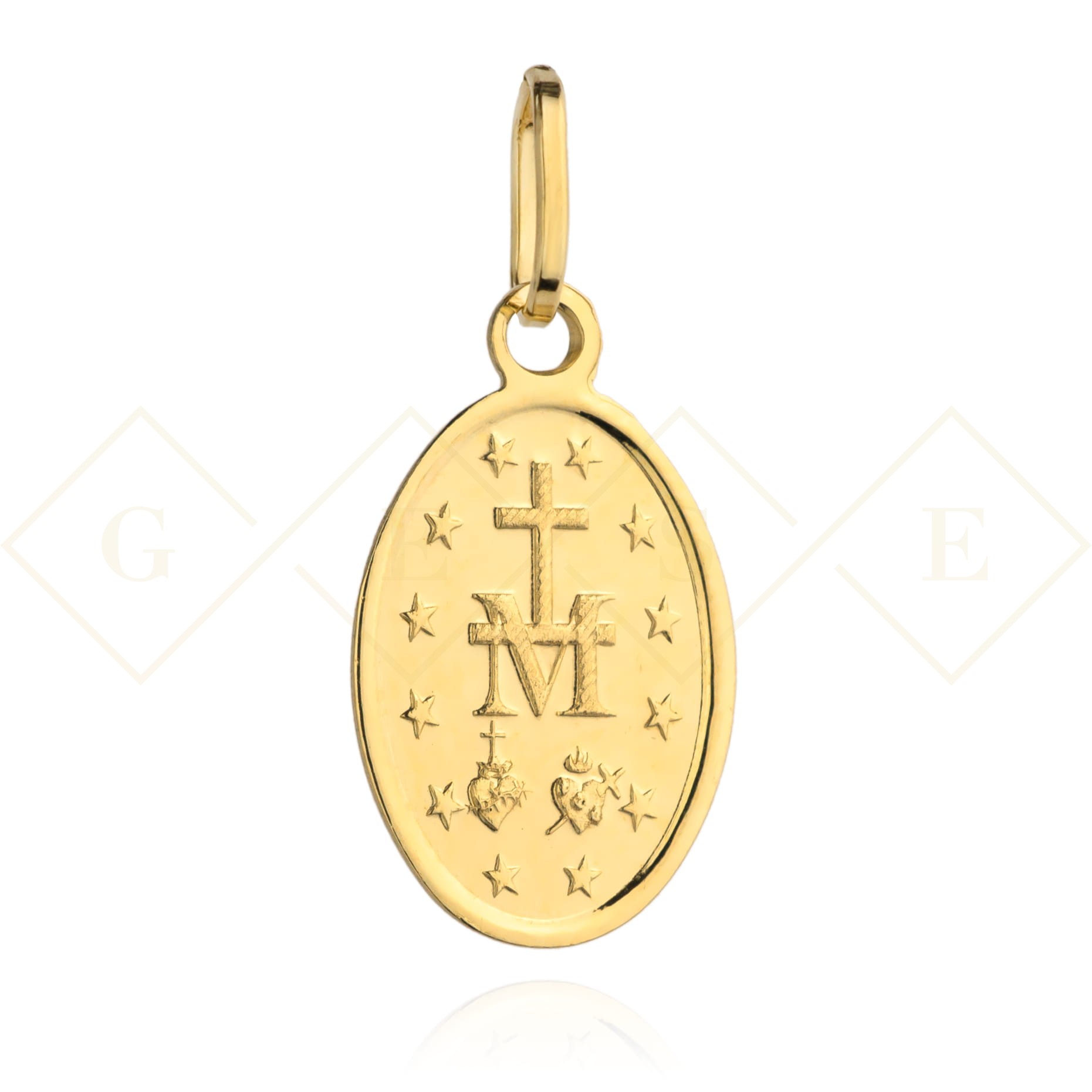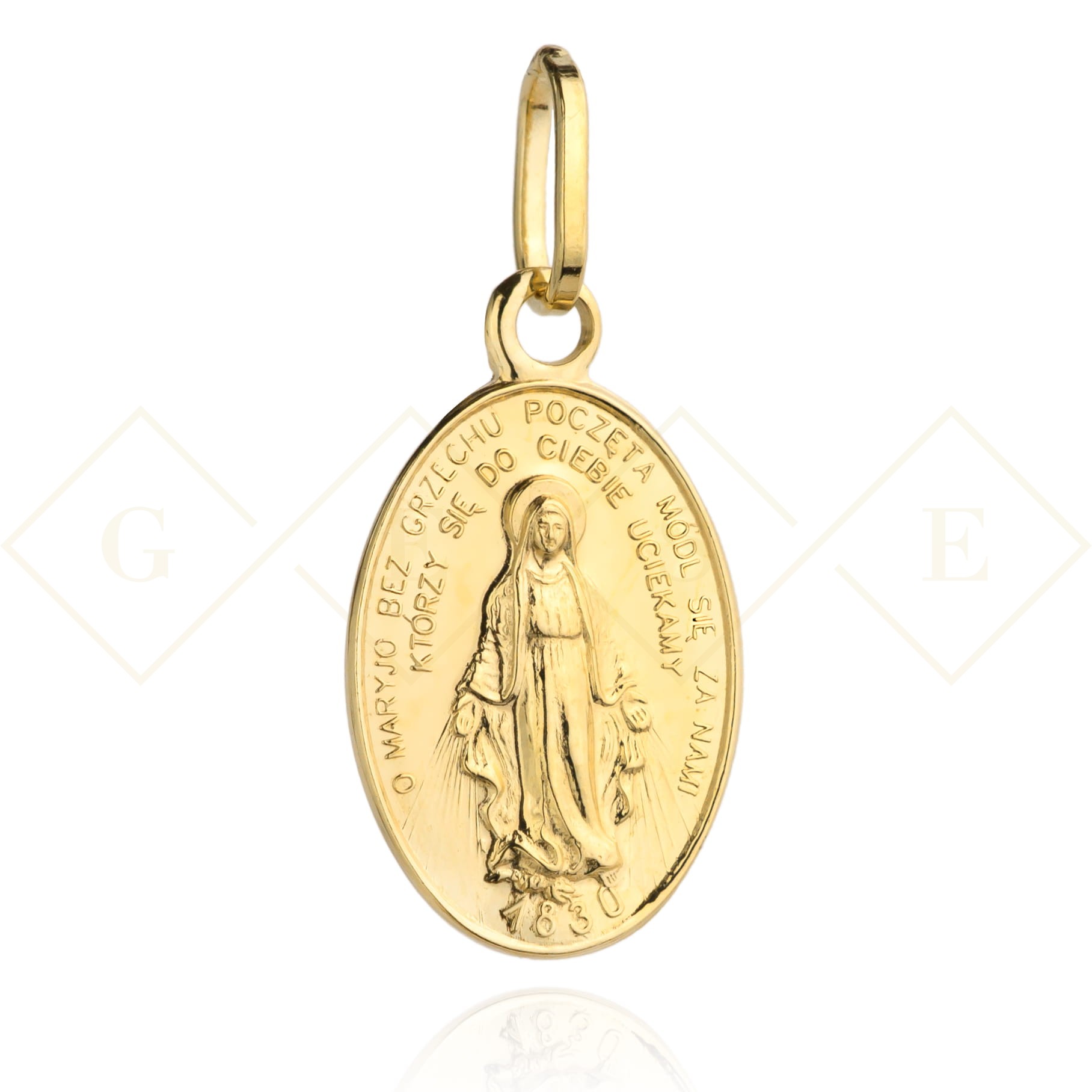 Precyzyjnie wykonany złoty medalik próby 585. Cudowny medalik z wizerunkiem Matki Boskiej. Złoty medalik to pamiątka chrztu, pierwszej komunii, bierzmowania, ważnego jubileuszu czy rocznicy.