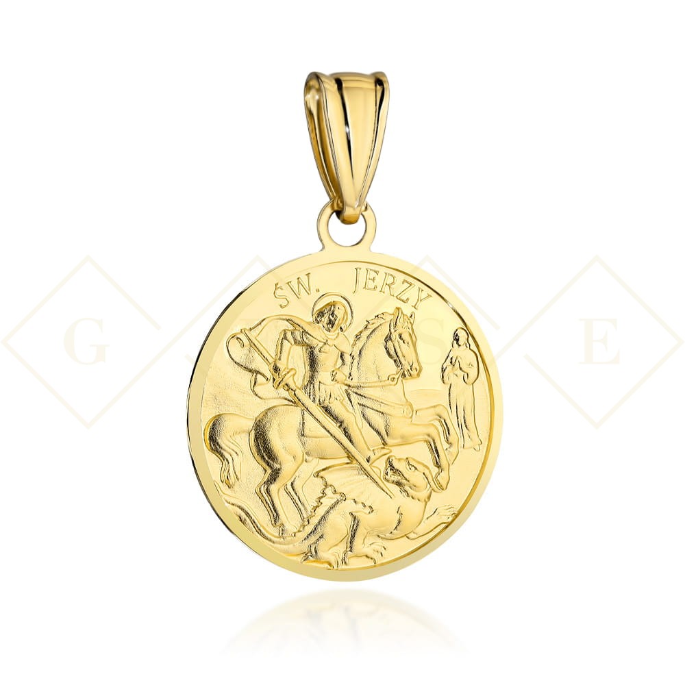 Precyzyjnie wykonany złoty medalik próby 585 z wizerunkiem świętego Jerzego.