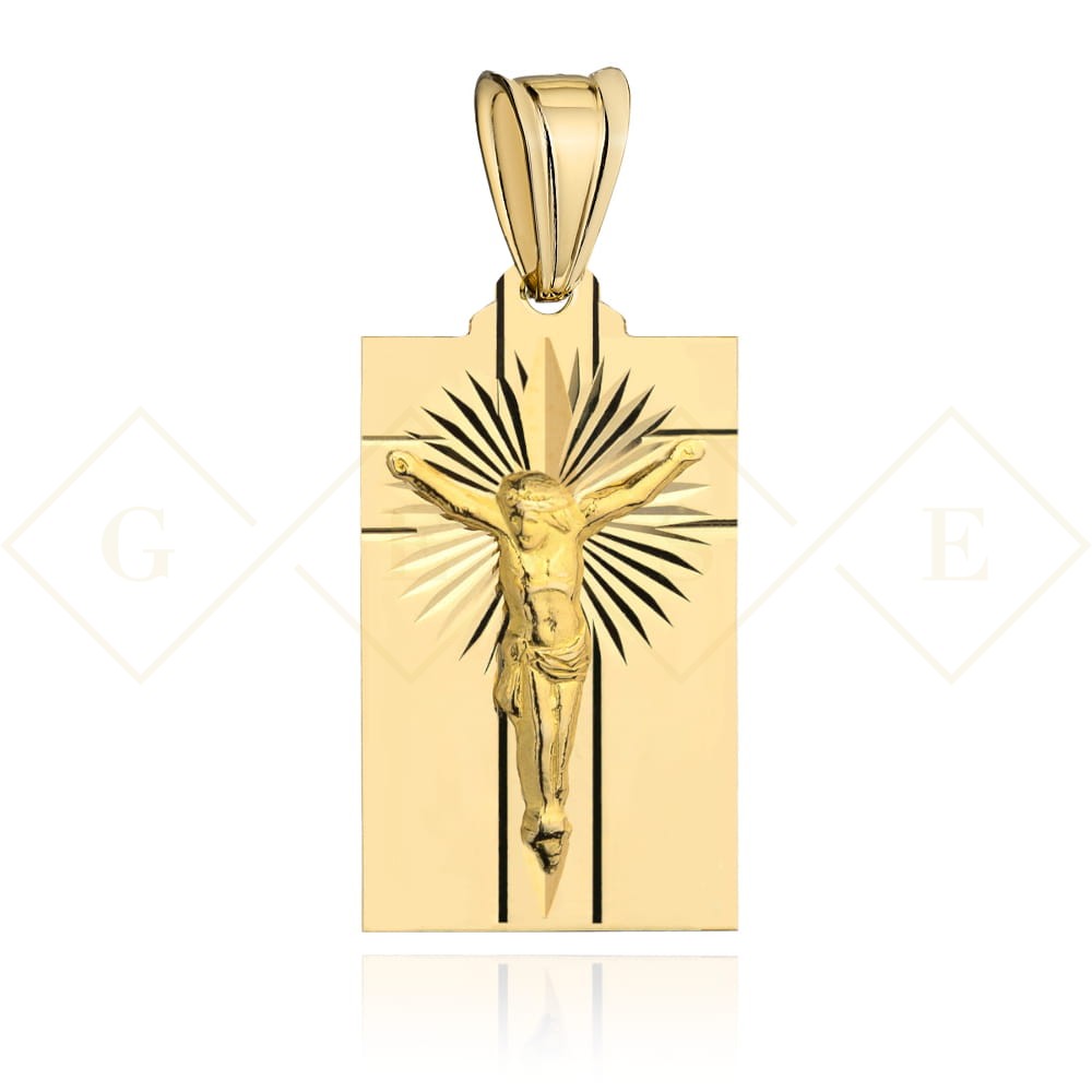 Medalik złoty z ukrzyżowanym Jezusem i promieniami na blaszce