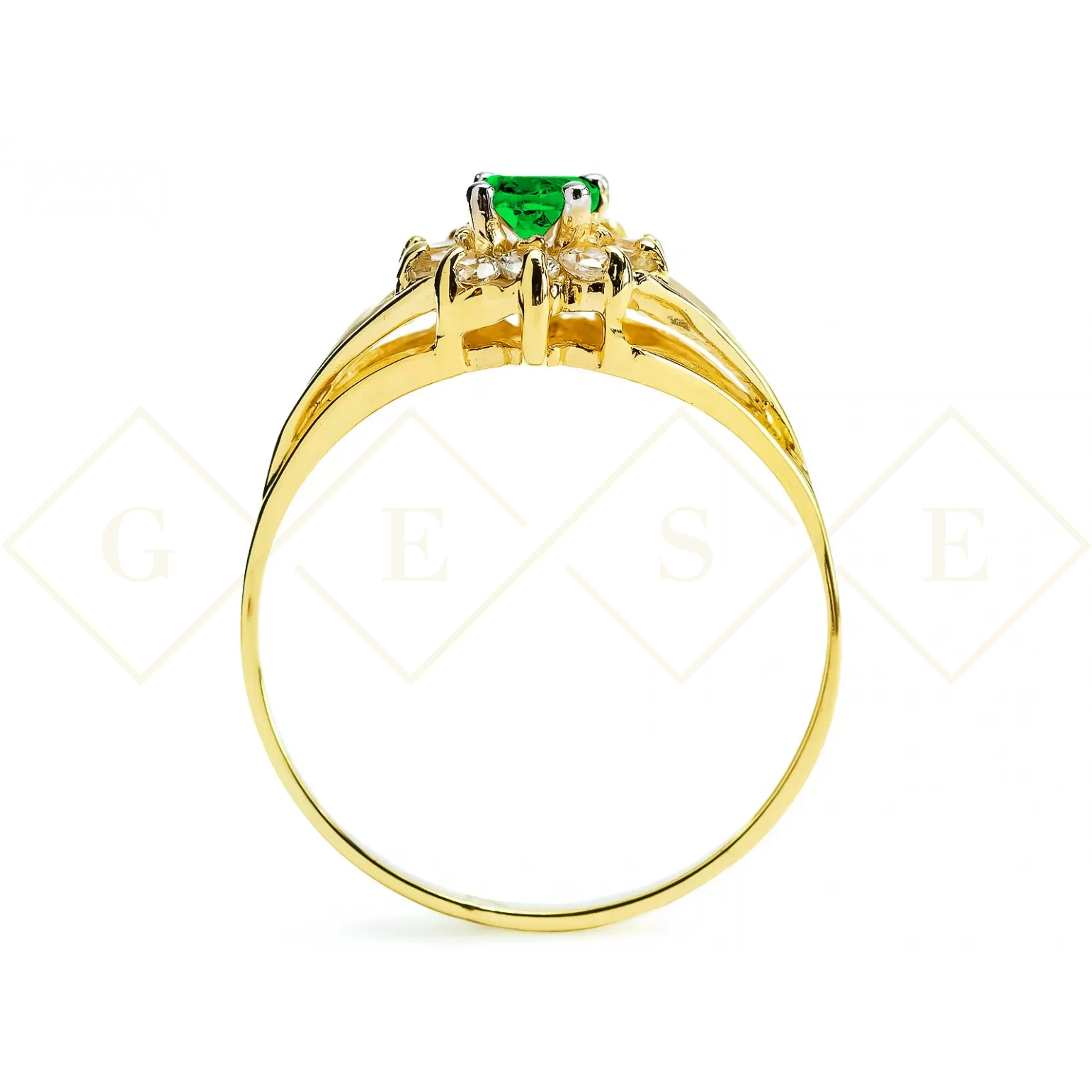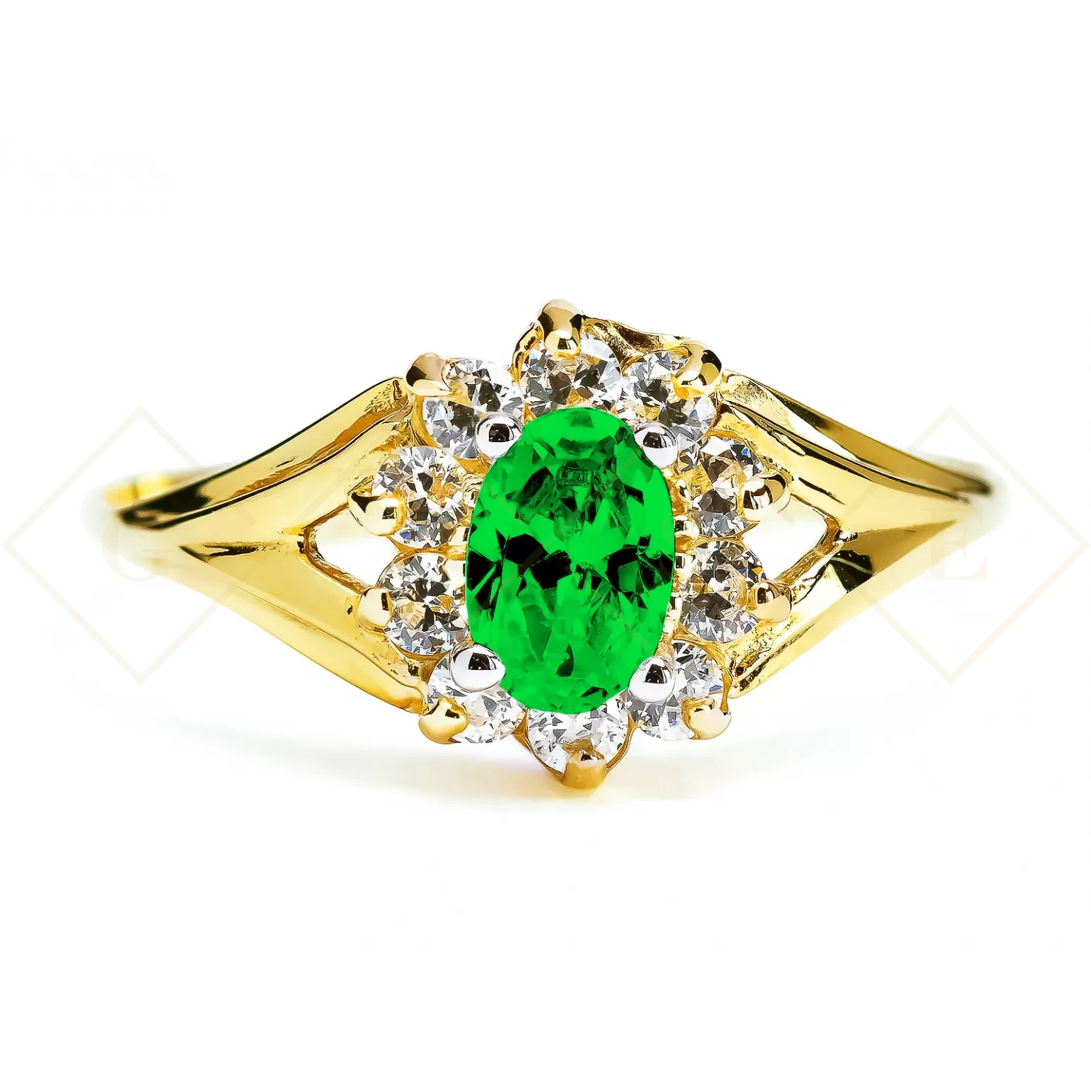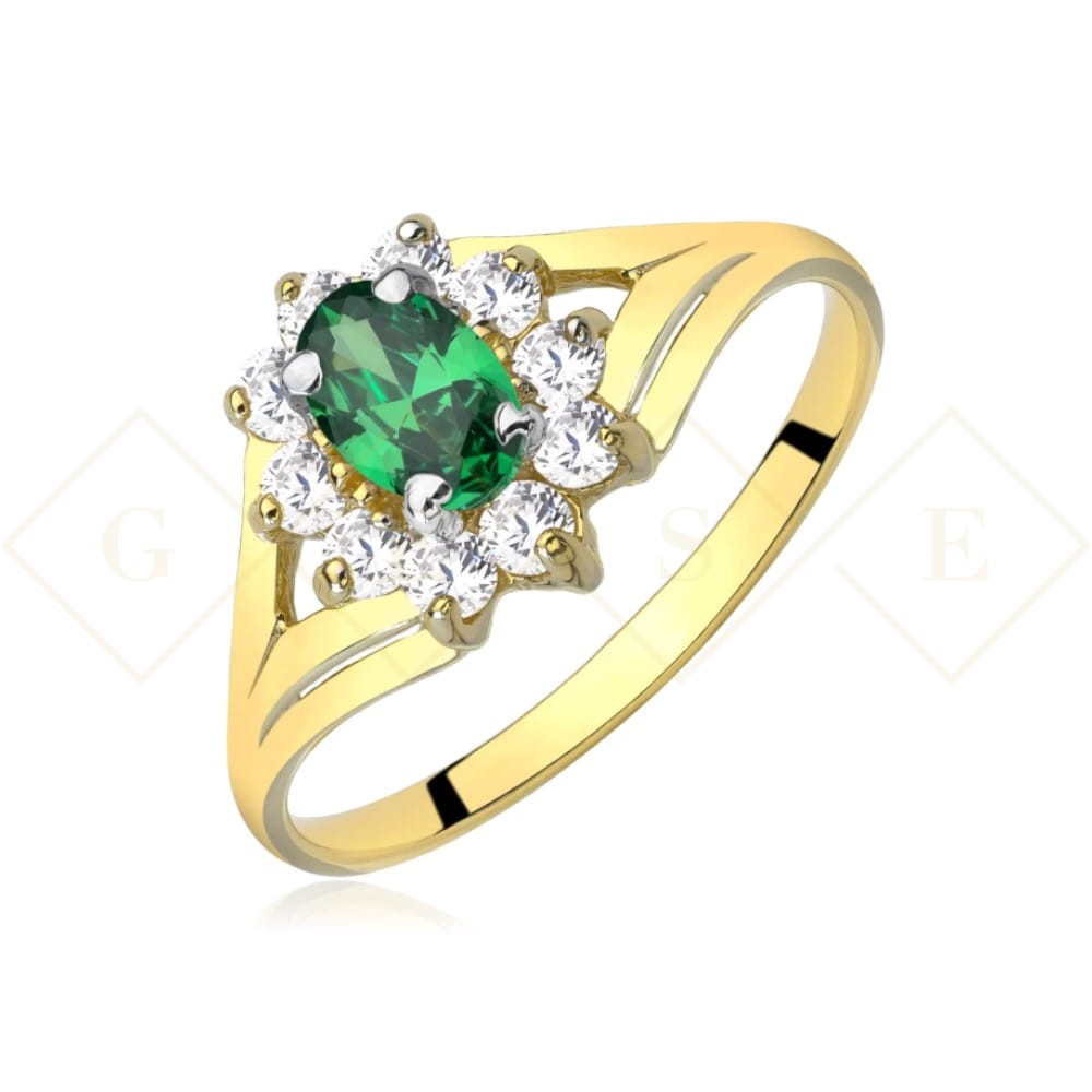 Przyciągający spojrzenie i oryginalny wzór złotego pierścionka. Zdobiony dużym owalnym kamieniem w kolorze zielonym, otoczony mniejszymi cyrkoniami.
