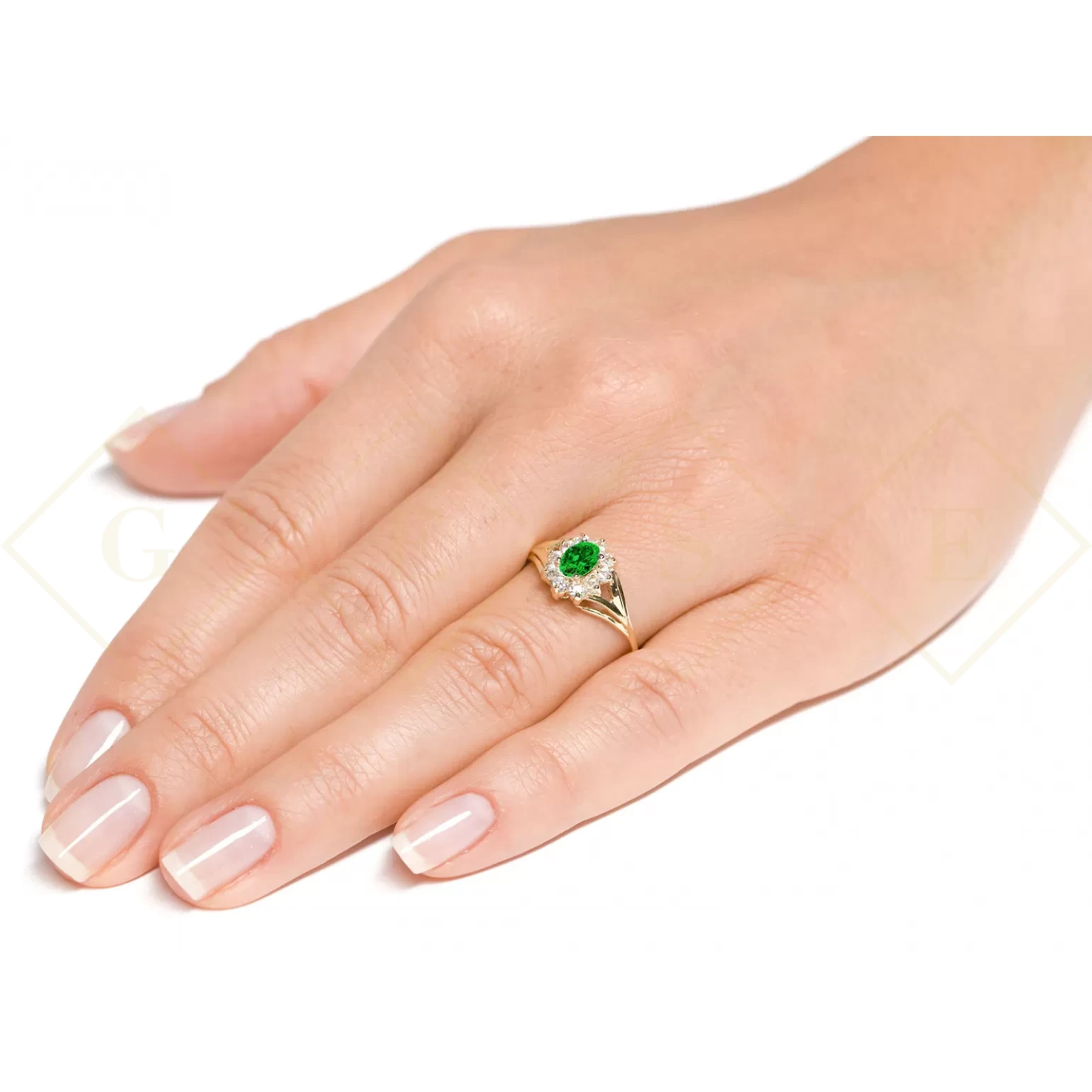 Modny złoty pierścionek z cyrkoniami Markiza szmaragdowa pr. 333