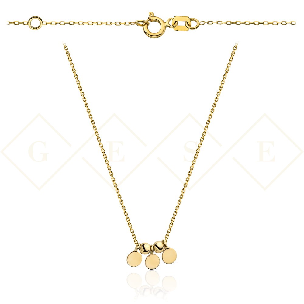 Precyzyjnie wykonany złoty naszyjnik próby 585. Celebrytka z modnymi okrągłymi elementami.