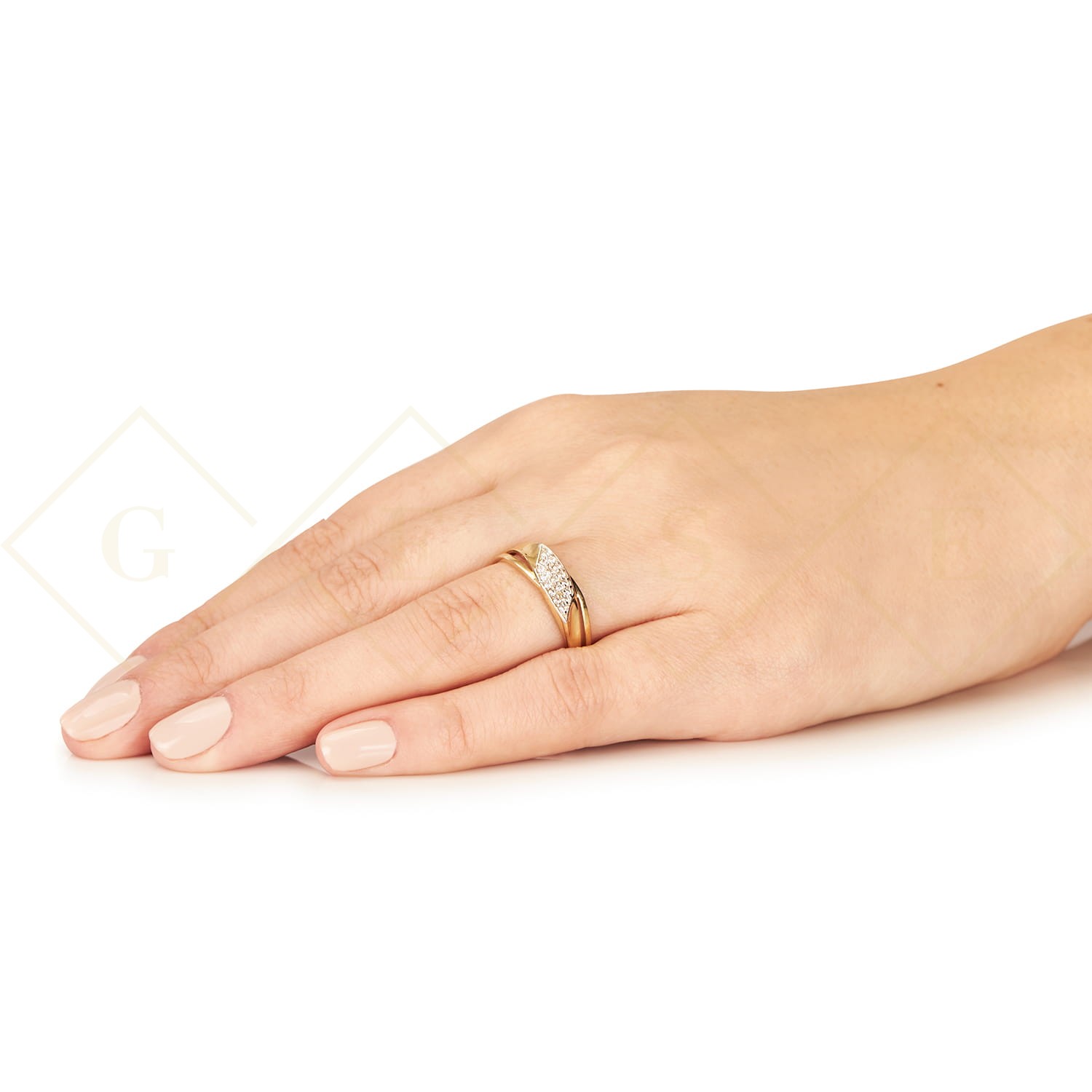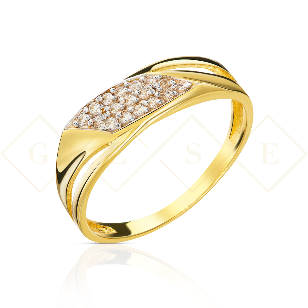 Precyzyjnie wykonany złoty pierścionek próby 585. Klasyczny pierścionek z cyrkoniami ułożonymi w kształcie rombu.