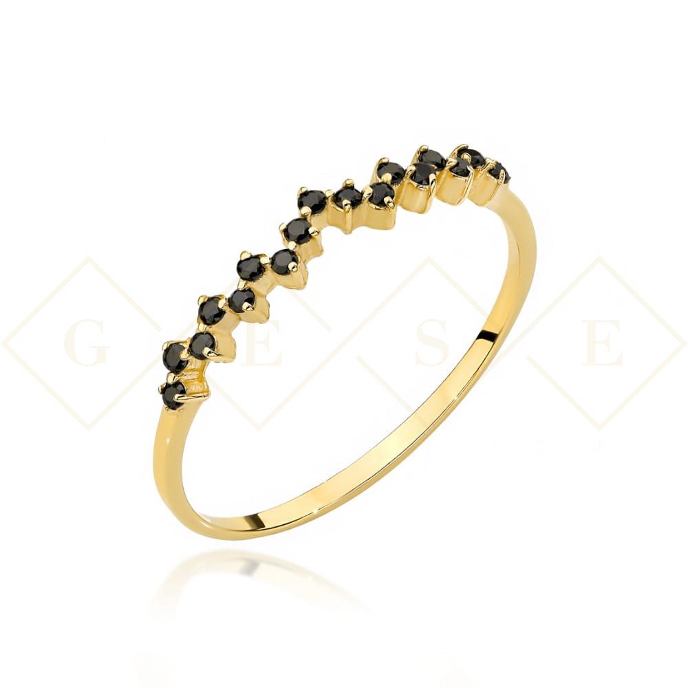 Precyzyjnie wykonany złoty pierścionek próby 585 z czarnymi kamieniami.
