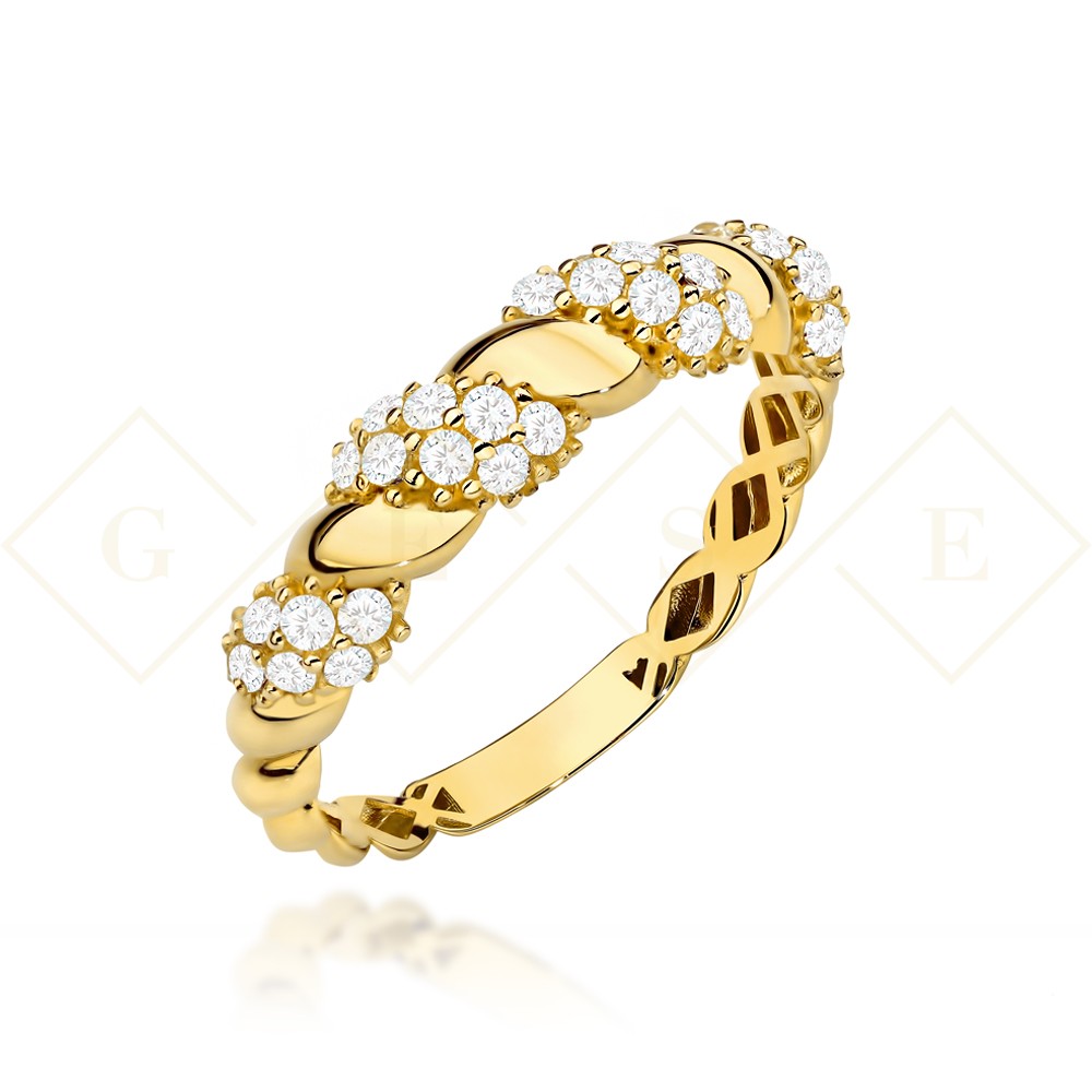 Pierścionek złoty pleciony naprzemiennie zdobiony cyrkoniami