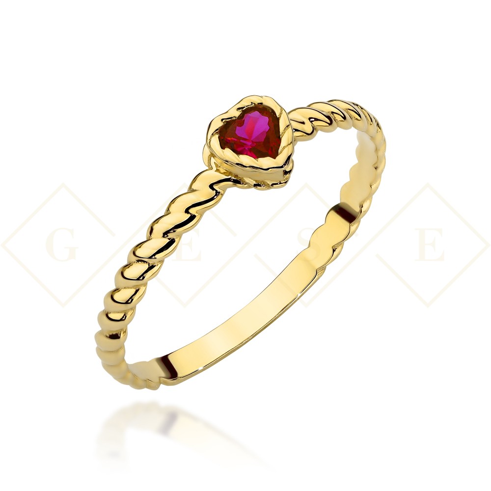 Pierścionek złoty pleciony z serduszkiem w kolorze rubinowym