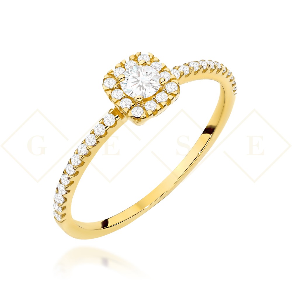 Pierścionek złoty z centralną cyrkonią w kwadracie zdobiony cyrkoniami