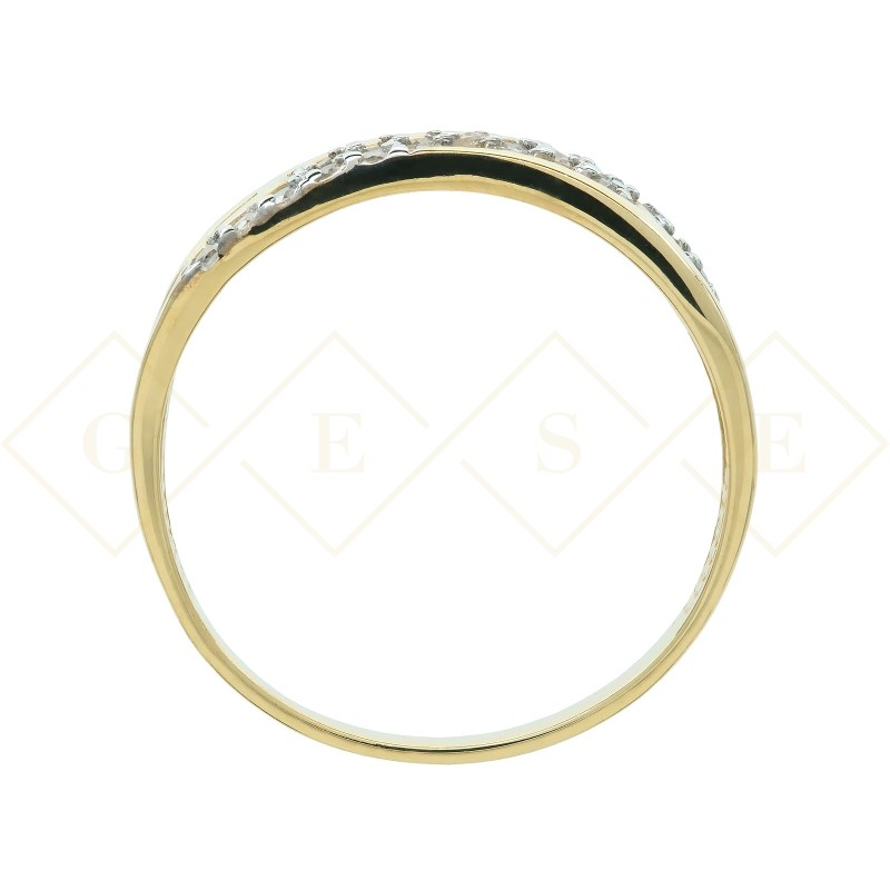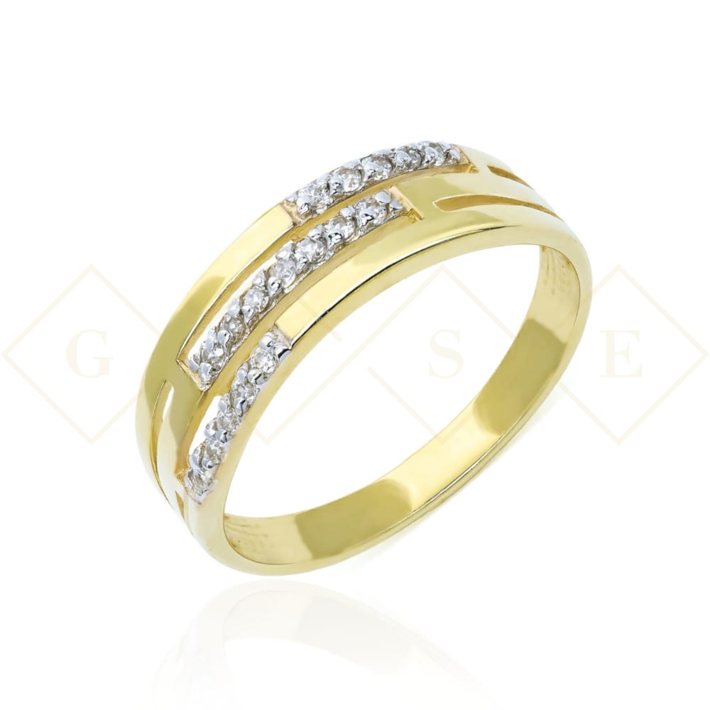 Przyciągający spojrzenie i oryginalny wzór złotego pierścionka. Zdobiony małymi kamieniami.