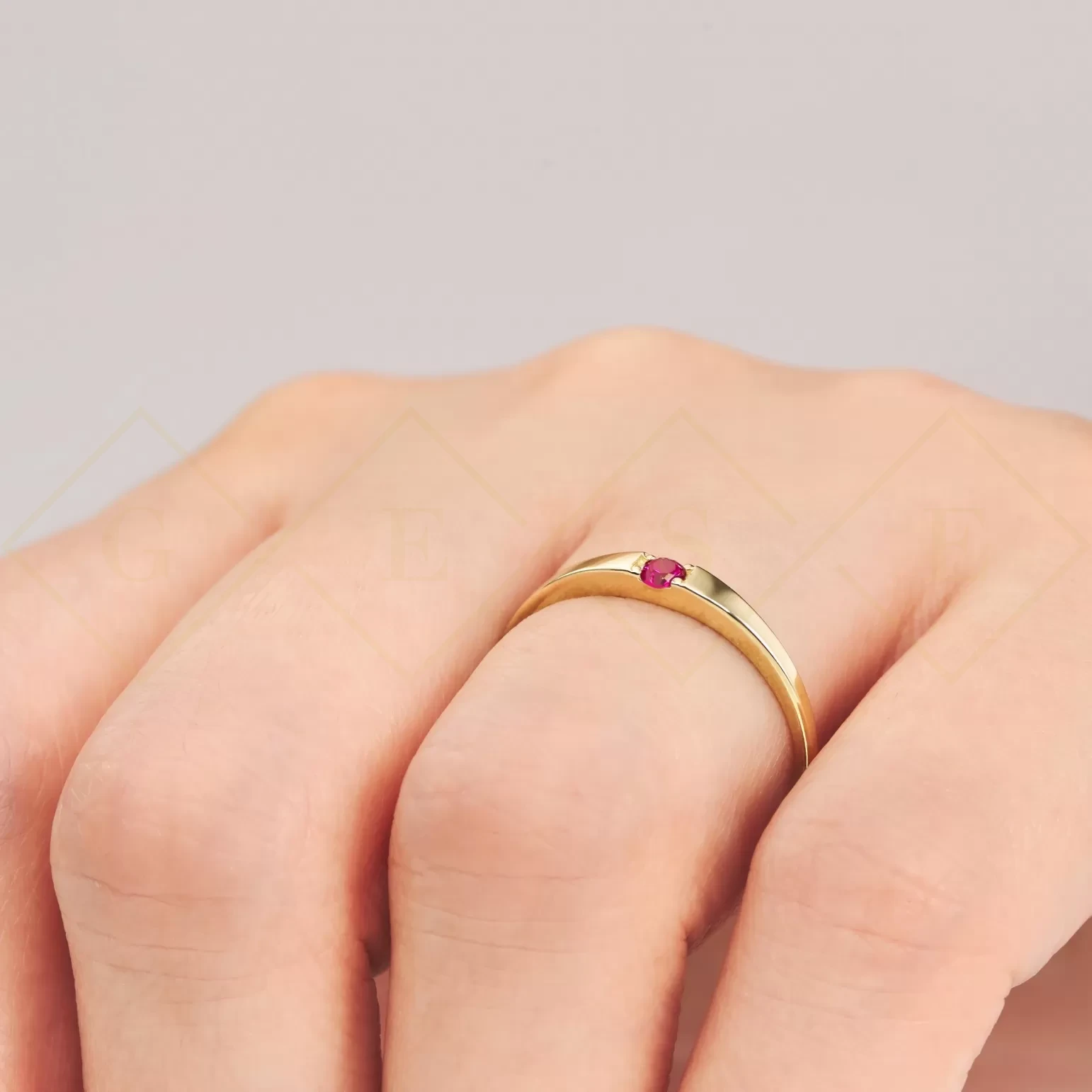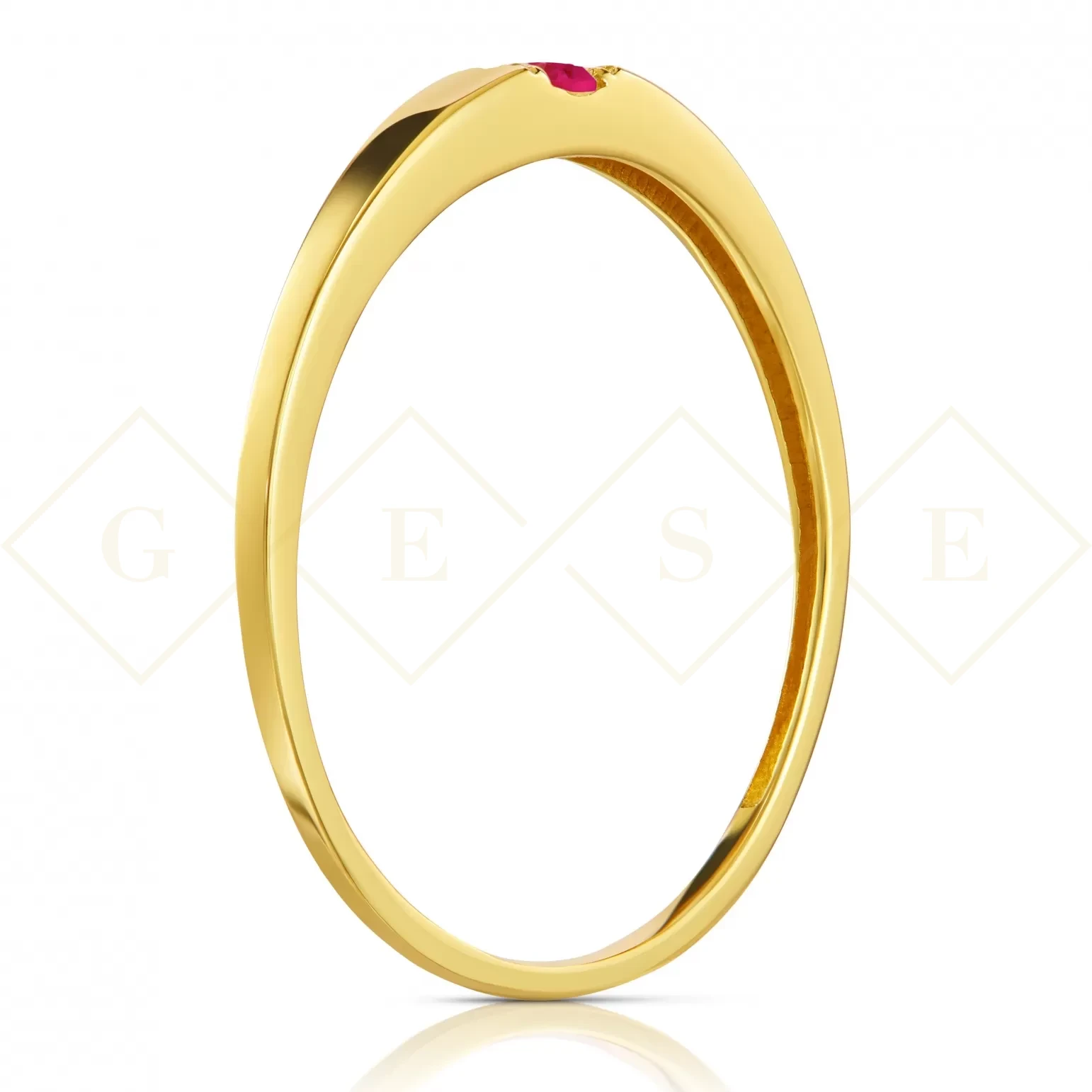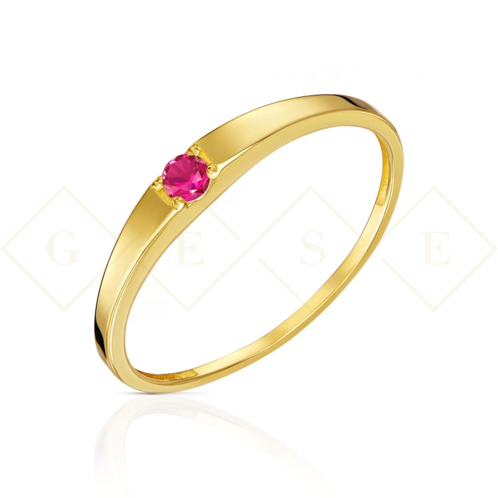Złoty pierścionek z pięknie wkomponowanym rubinowym kamieniem centralnym.