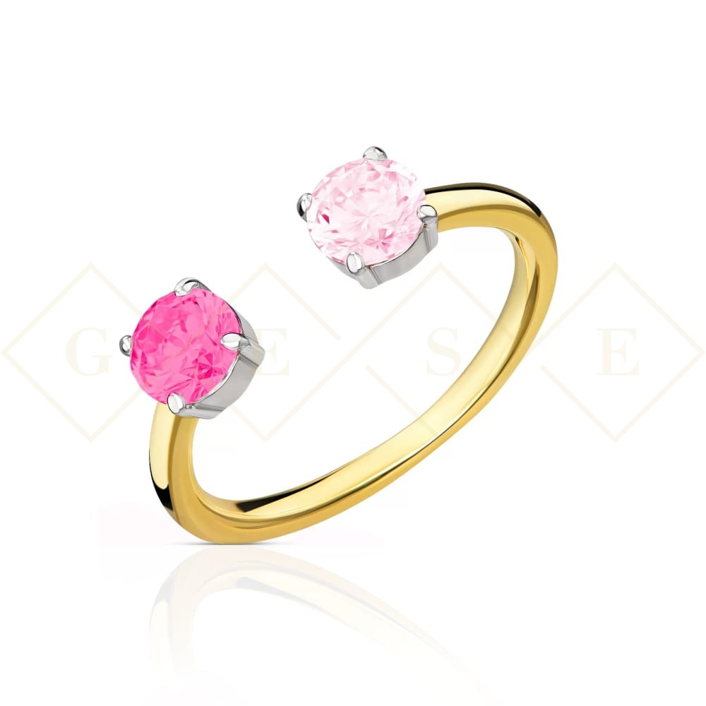 Złoty pierścionek zdobiony dwiema dużymi cyrkoniami w dwóch kolorach